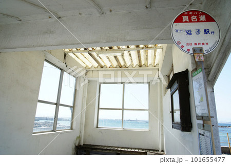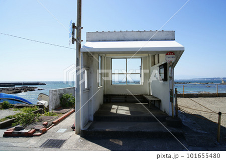 葉山で待合所から海が見える真名瀬バス停