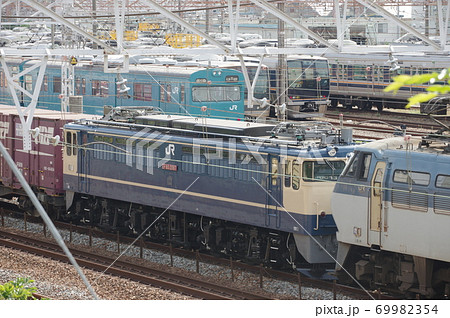 山陽本線西明石駅付近の待避線に停車する下り貨物列車に連結されて回送中のEF65