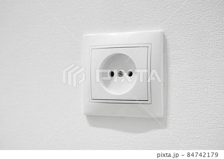 Common cheap plastic AC power wall socket. German circular recess socket with two round holes for 2 pins europlugs types C, E and F. Not grounded European white electrical outlet CEE 7 against wall