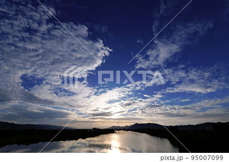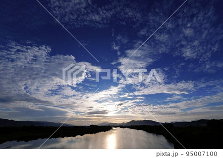 鱗雲が現れた秋の夜明け空と川の朝景・超広角・空主体・220925am