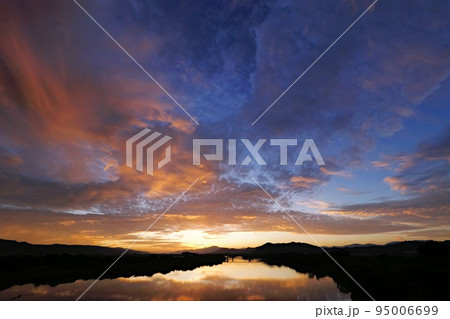 多様な雲が劇的に朝焼けした秋の夜明け空と川の朝景・超広角・空主体・220925am