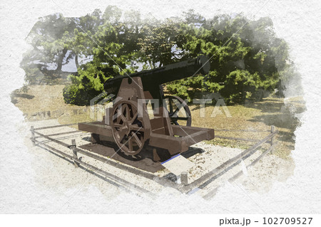 水彩画風 佐賀城跡 24ポンドカノン砲 佐賀県佐賀市