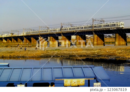 小田急、多摩川旧橋梁を渡る2400形HE車の8連、1982年1月3日