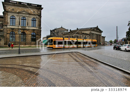 旧市街の歴史的建造物の前を快走するドイツ、ドレスデンの路面電車(トラム)