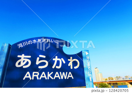 荒川土手に立つ「あらかわ」カンバンと荒川大橋とエルザタワーの青空の風景