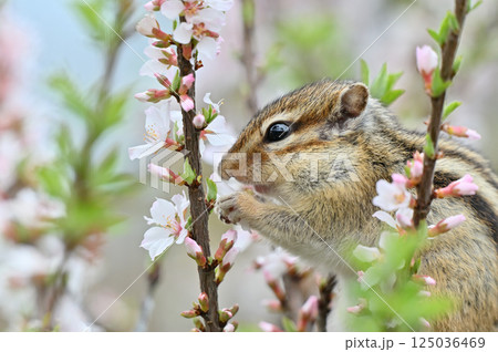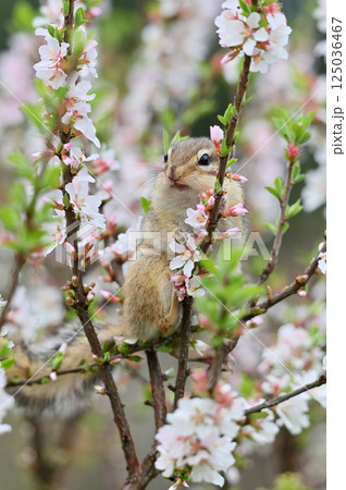 ユスラウメの木に登るシマリス 春の素材