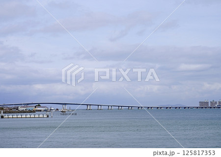 千葉県側から東京湾アクアラインと海ほたるの風景