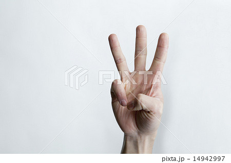 グレーのスーツを着て指を3本立てるミドル男性ビジネスマン