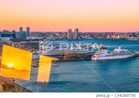 日本の横浜都市景観3隻日本の豪華客船、にっぽん丸、飛鳥Ⅱ、三井オ号が横浜港に。夕日…希望の明日へ