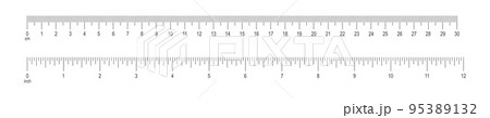 Horizontal scale with 12 inch and 30 centimeter markup and numbers. Measuring charts of metric and imperial unit. Distance, height or length measurement tool templates