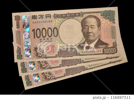 テーブルに並べた一万円札3枚(三万円)の俯瞰撮影 (新紙幣 渋沢栄一 白バック)