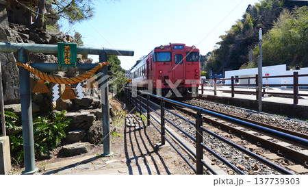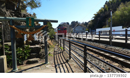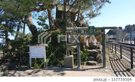 春の雨晴海岸 義経社と氷見線