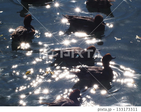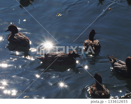 日差しを浴びた水面とカモたち(鳴きながら泳ぐ江ノ口川の鴨)