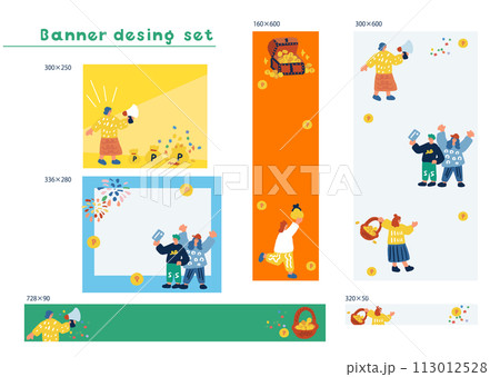 手書きのイラスト ポイントやコイン、人々のバナーデザインセット
