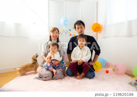 1歳男児の誕生日を祝う家族と愛犬 1歳 一升餅