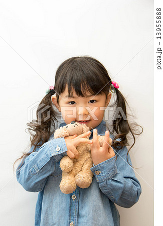 犬のぬいぐるみを抱える幼児 (4歳児) (白バック)