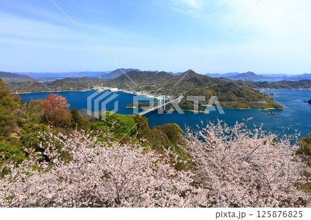 【愛媛県】桜咲く春のカレイ山展望公園から眺めた 伯方大島大橋(しまなみ海道)