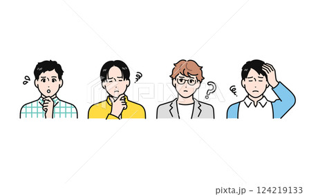 悩むカジュアルな若い男性4人のシンプルなベクターイラストセット