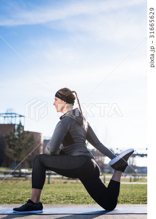Young woman stretching her quadriceps muscles by grabbing her ankle