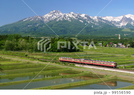 残雪の妙高山の麓、田植えが済んだ田んぼの中を快走するトキ鉄の観光急行