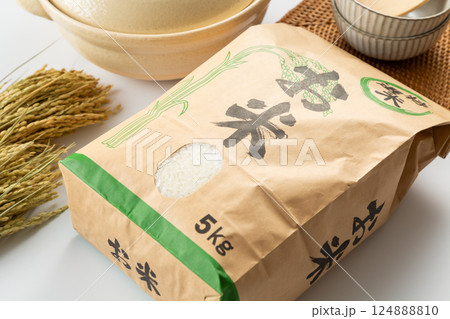 テーブルに置かれた米袋と枡に入った米粒、 お米が入った紙袋