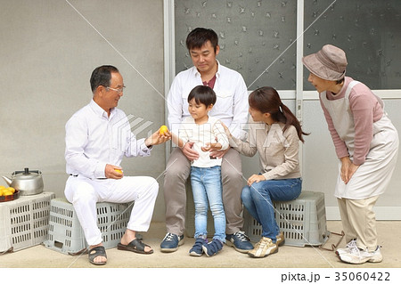 農家の納屋の前4 3世代家族5人 ニーアップ