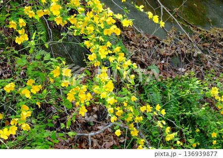 山斜面に咲く黄色いヤマブキの花 【相模原市津久井 4月】