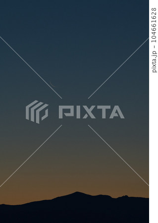 北杜市白州町、夜明けの空に月齢28.5有明の月(位置:左下)