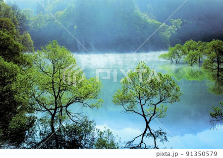 朝霧に包まれる新緑の「白川湖の水没林」(山形県飯豊町)