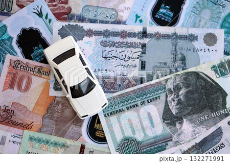 Egyptian pound currency money bills and toy car close up. The concept of car ownership
