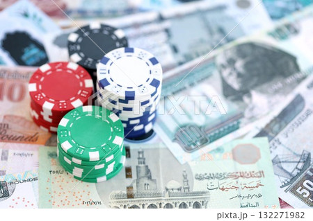 Egyptian pound currency money bills and bunch of casino chips close up. The concept of gambling and casino games