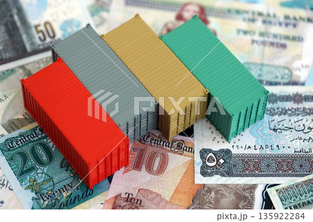 Egyptian pound currency money bills and toy cargo containers close up. The concept of shipping and logistics