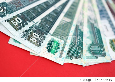 Egyptian pound money bills in big amount on red close up. Finance and banking concept