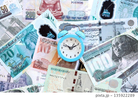 Egyptian pound currency money bills and alarm clock close up. The concept of time management and income
