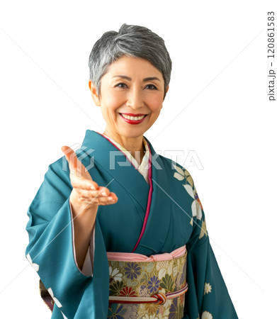ビジネス シニア 女性 グレイヘア スーツ 指差し