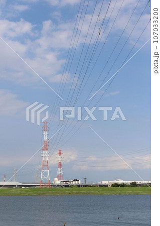 千葉県市川市妙典の送電鉄塔と江戸川放水路