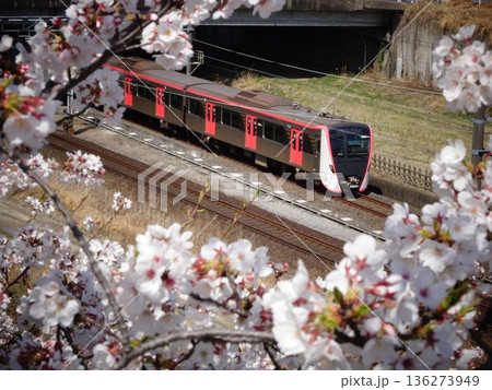 千葉県白井市付近北総線を通る都営地下鉄浅草線の新型車両5500形電車と満開のさくら