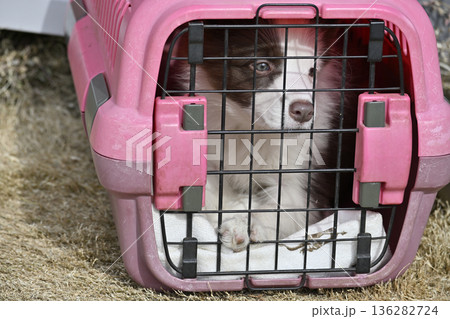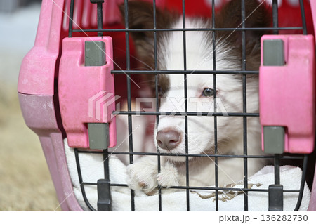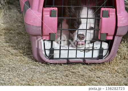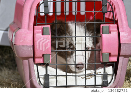 クレートでお散歩する子犬 パピー ボーダーコリー
