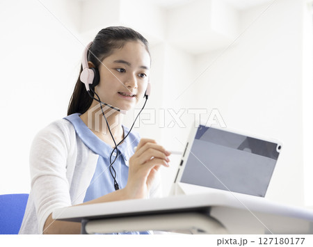 タブレット学習をする女の子