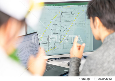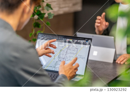 工事工程表を説明する男性一級建築士 ネットワーク工程表 工事監理 2人