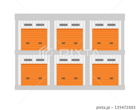 2階建てでオレンジ色のシャッターが並ぶトランクルーム建物イラスト