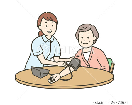 血圧計で血圧を測る手助けをする看護師と高齢女性と上半身イラスト