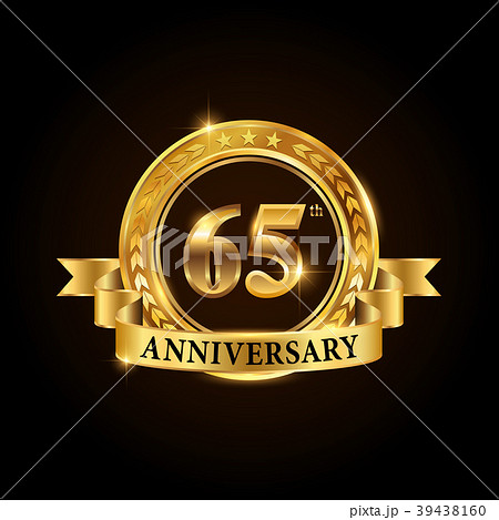 65 Anniversary gold numbers with golden confetti. Celebration 65th anniversary event party template