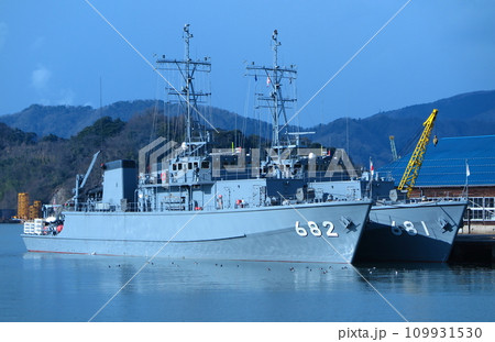 海上自衛隊の舞鶴基地、停泊中の掃海艇「のとじま」と「すがしま」
