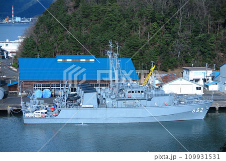 海上自衛隊の舞鶴基地、停泊中の掃海艇「のとじま」と僚船