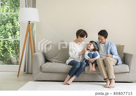 笑顔の3人家族 ポートレート 両親と小学校低学年の女の子