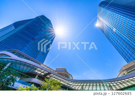 日本の東京都市景観 高輪ゲートウェイ駅前の高輪ゲートウェイシティなどを望む