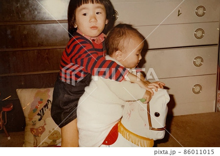 昭和50年代 おもちゃの馬に乗って遊ぶ姉妹