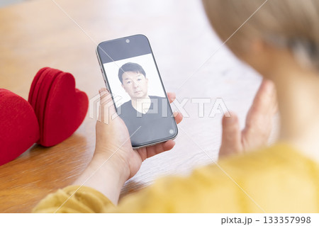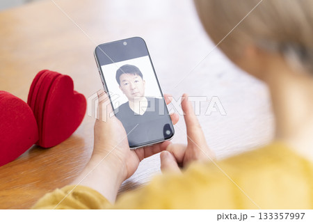 スマホでマッチングアプリをするシニア女性 アウトフォーカス
