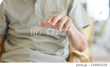 Elderly man sitting in clinic waiting area scrolling mobile phone